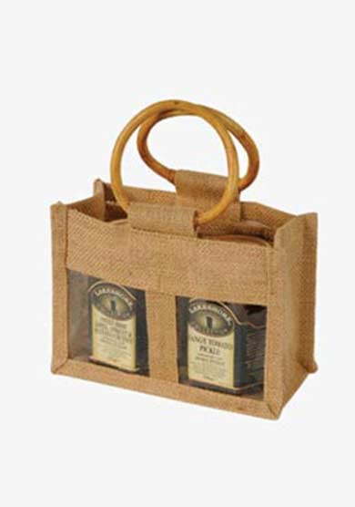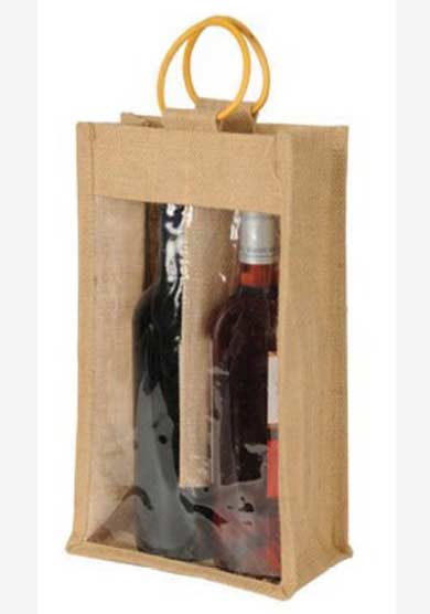 Two Jar bag made from Natural Laminated Jute 15/14 with inside partition and cane handles. Front with see through window. Ideal for gifting cosmetics or alikes inside.