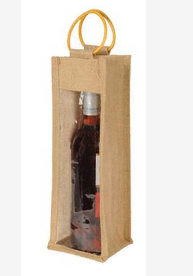 Single bottle bag made from Natural Laminated Jute and dyed gusset with self handle. Ideal for promotional distribution by Whineries & Distillaries with products inside as give away bags.