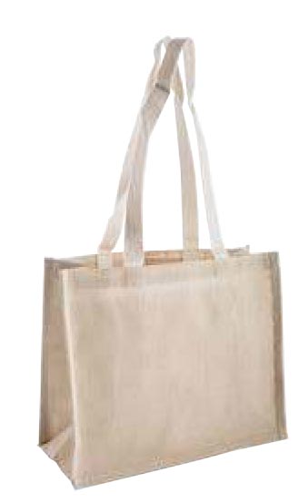 Premium Juco reusable bag for promotional use or shopping. High quality bag made from 30% cotton and 70% jute. Fitted with natural cotton tape handles in shoulder length or short soft loop handles making this bag convenient to carry