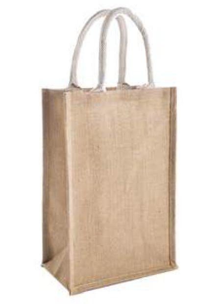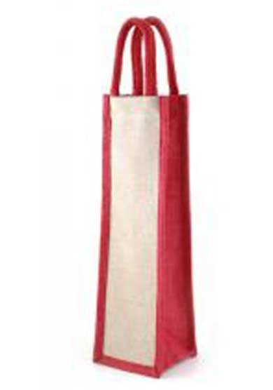 Single bottle bag made from Natural Laminated Jute and dyed gusset with self handle. Ideal for promotional distribution by Whineries & Distillaries with products inside as give away bags.