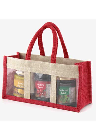 Three Jar bag made from Natural Laminated Juco with Dyed Laminated Jutr Gusset. Front with see through window. Ideal for gifting cosmetics or alikes inside.