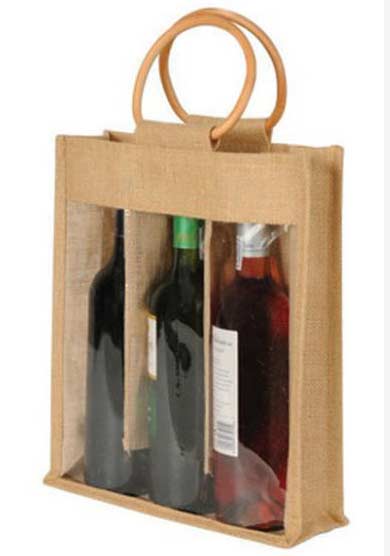 Two Jar bag made from Natural Laminated Jute 15/14 with inside partition and cane handles. Front with see through window. Ideal for gifting cosmetics or alikes inside.